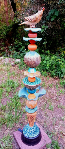 All my garden totems are wet weather proof stoneware shapes that are threaded on to a 1/2" iron pipe and attached to a round cement base. They may be placed on a deck, or they may be installed into the ground, either loosely or cemented. The totems are moveable and washable: you can take them down for storage or to relocate them, and they can be hosed down for cleaning.